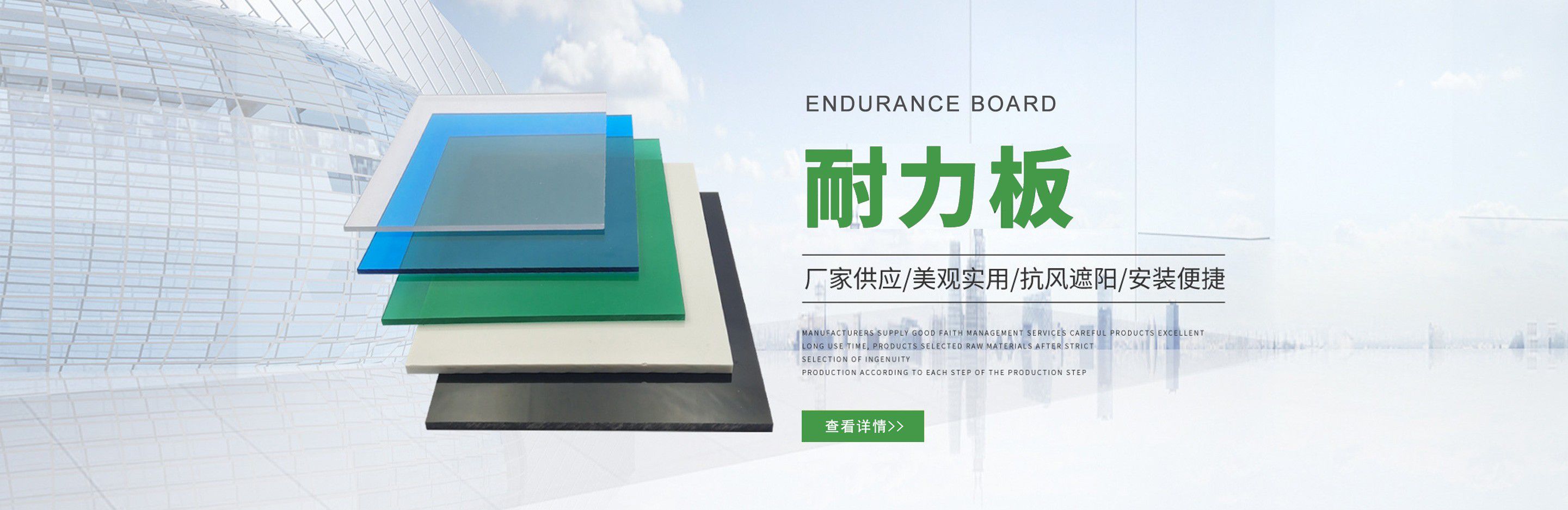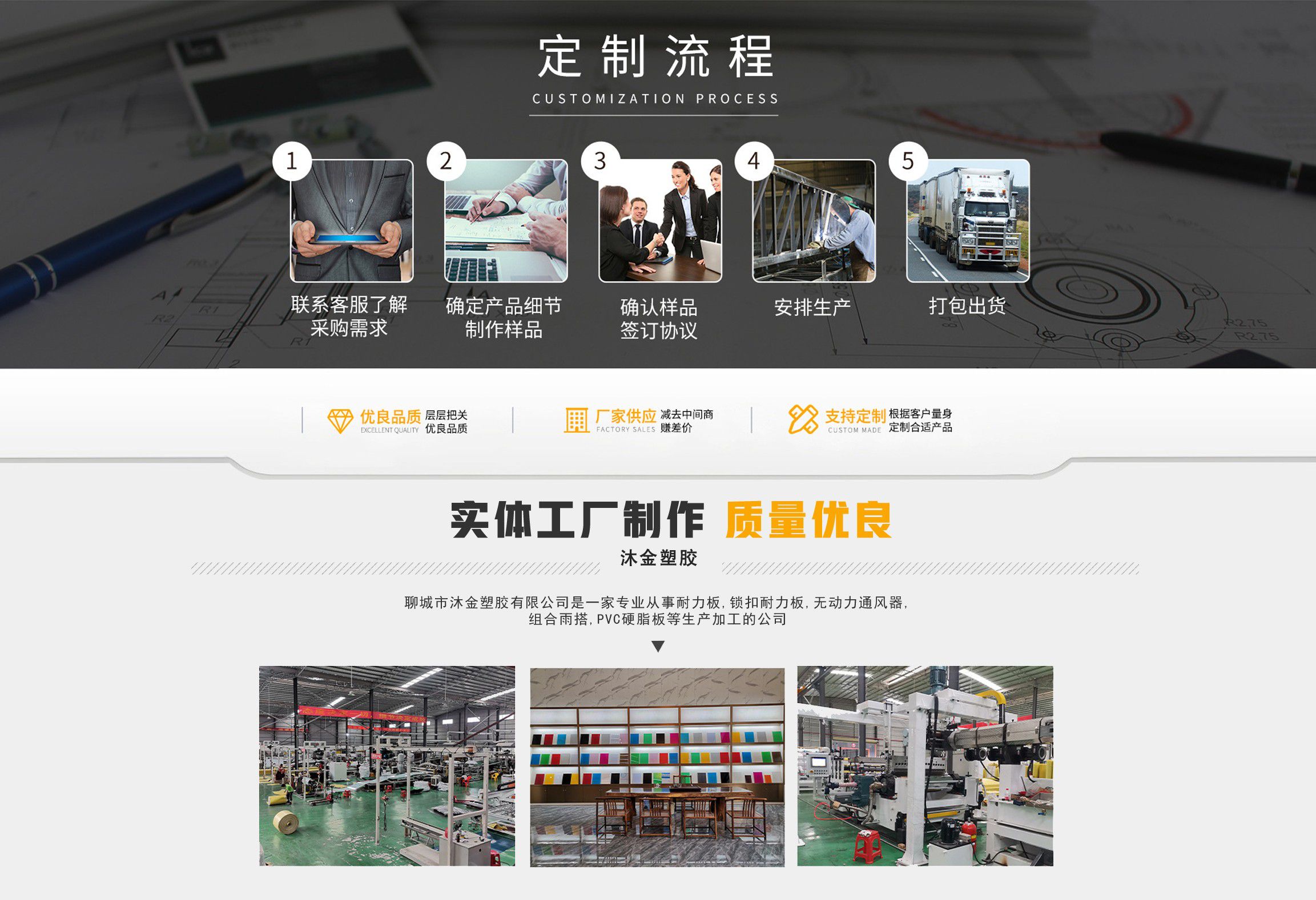 聊城市沐金塑膠有限公司注冊資金2180萬元,占地20000余平方,擁有自建廠房15000平方,員工100余名。10余年來,公司主營耐力板,鎖扣耐力板,耐力板深加工,無動力通風器,組合雨搭,PVC硬脂板,耐力板廠家等板材的發展戰略,逐漸成長為綜合性企業。 公司擁有多條板材共擠生產線,采用世界知名品牌進口原材料和先進工藝,依據完善的ISO9001質量管理體系和ISO14001環境管理體系,為產品的卓越品質提供了強有力的保證。憑借過硬的創新能力和堅實的硬件基礎,贏創已成為國內領先的熱塑性板材生產商,產品被廣泛應用于建筑業、農業、工業、廣告業、安防行業及DIY領域。 公司始終致力于通過提供最優的板材應用解決方案,為客戶創造最高的價值;堅守創新、質量、靈活、服務和速度的核心價值觀;堅持“完美的產品需要完美服務的支持”的經營理念,努力實現成為世界領先的板材與解決方案供應商的夢想。 在未來,公司將立足客戶需求,不斷改變和完善現有產品,拓展產品線和充分開發板材的應用領域,為客戶創造全方位的價值。同時更好地實現員工的價值,實現公司團隊的價值。我們將與您一起創贏未來! 企業使命:成為世界領先的板材與解決方案供應商。 公司愿景:通過提供最優的板材應用解決方案,為客戶創造最高的價值。 核心價值觀:質量...